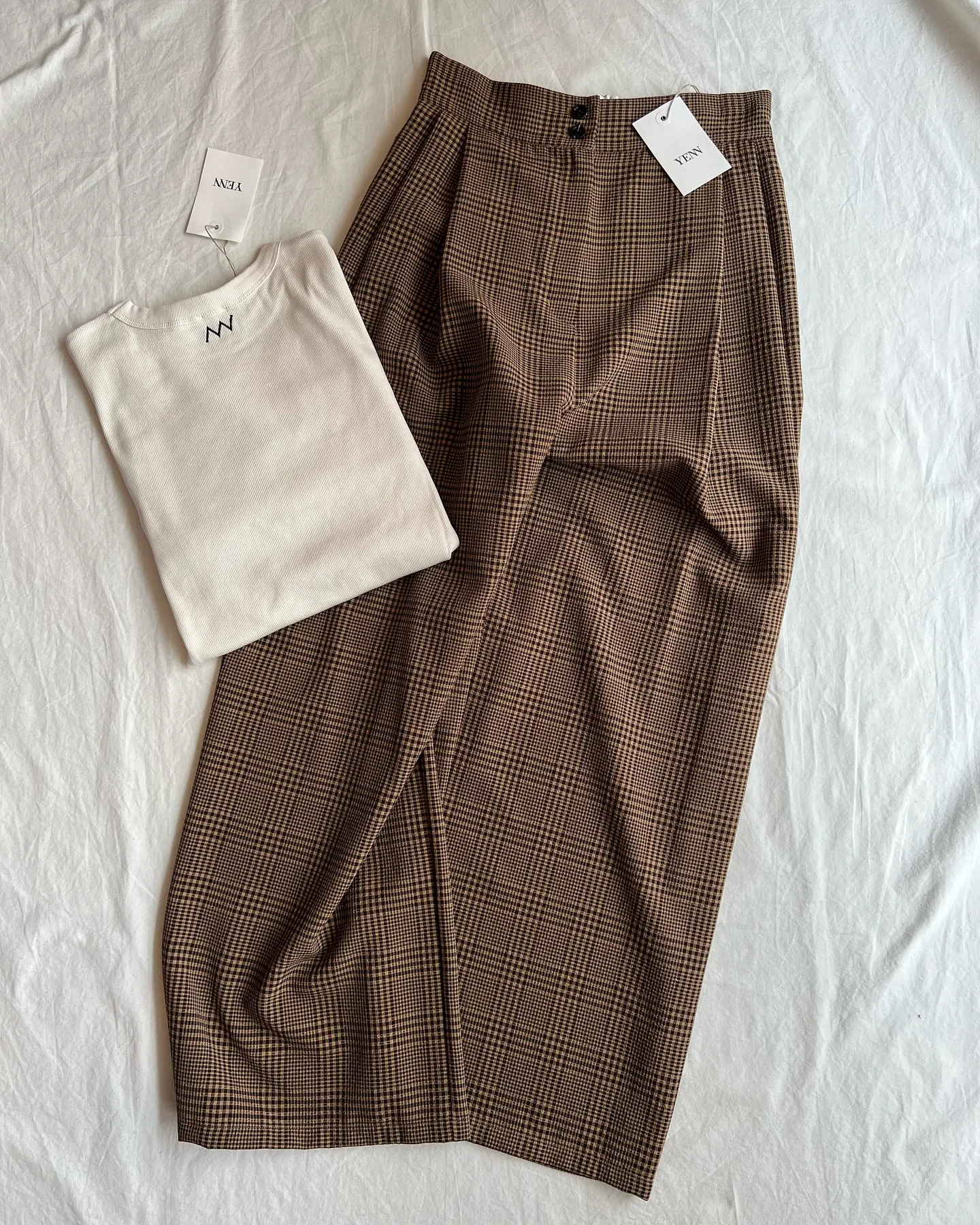 ⭐️YENN#福岡セレクトショップLARASELECTITEMS店頭・オンラインショップにて販売中です☆☆YENNPLAID2TUCKWIDEPT¥25300税込シボ感のあるチェック柄の生地を使用したワイドパンツです。太めのベルトと2本のタ…